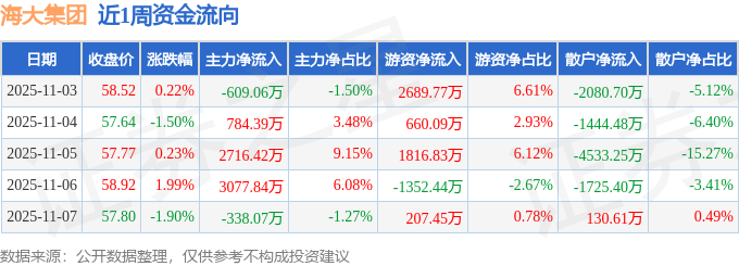 资金流向数据方面,本周海大集团主力资金合计净流入5631.52万元,游资资金合计净流入4021.7万元,散户资金合计净流出9653.22万元。本周资金流向一览见下表:
