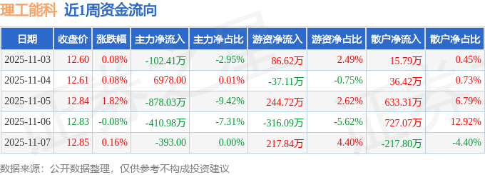 资金流向数据方面,本周理工能科主力资金合计净流出1390.76万元,游资资金合计净流入195.98万元,散户资金合计净流入1194.78万元。本周资金流向一览见下表: