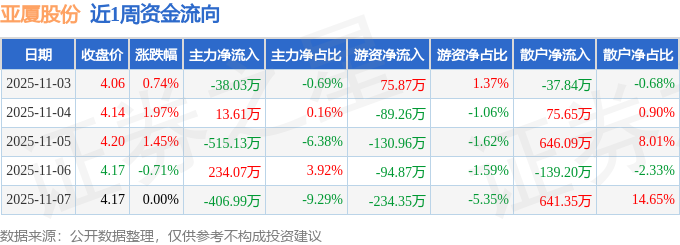 资金流向数据方面,本周亚厦股份主力资金合计净流出712.48万元,游资资金合计净流出473.57万元,散户资金合计净流入1186.05万元。本周资金流向一览见下表: