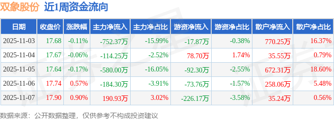 资金流向数据方面,本周双象股份主力资金合计净流出1440.0万元,游资资金合计净流出331.4万元,散户资金合计净流入1771.4万元。本周资金流向一览见下表: