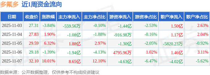 资金流向数据方面,本周多氟多主力资金合计净流入7.46亿元,游资资金合计净流出6.98亿元,散户资金合计净流出4835.61万元。本周资金流向一览见下表: