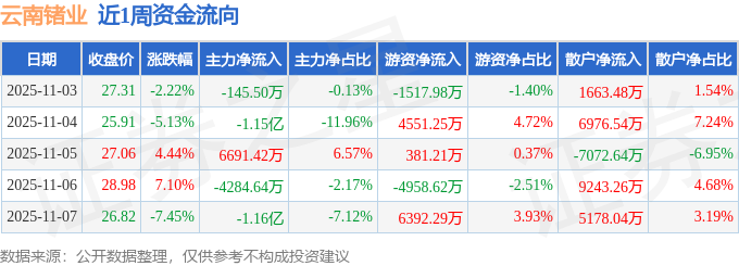 资金流向数据方面,本周云南锗业主力资金合计净流出2.08亿元,游资资金合计净流入4848.16万元,散户资金合计净流入1.6亿元。本周资金流向一览见下表: