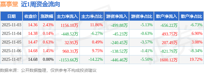 资金流向数据方面,本周嘉事堂主力资金合计净流入547.19万元,游资资金合计净流出1370.54万元,散户资金合计净流入823.35万元。本周资金流向一览见下表: