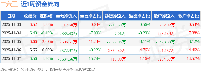 资金流向数据方面,本周二六三主力资金合计净流出5124.67万元,游资资金合计净流入390.65万元,散户资金合计净流入4734.02万元。本周资金流向一览见下表: