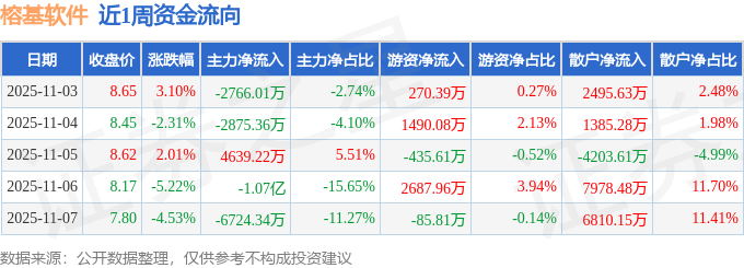 资金流向数据方面,本周榕基软件主力资金合计净流出1.84亿元,游资资金合计净流入3927.0万元,散户资金合计净流入1.45亿元。本周资金流向一览见下表: