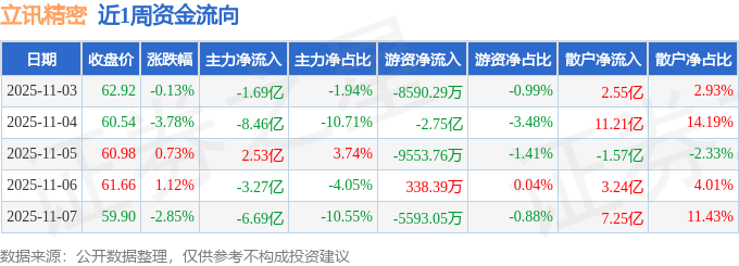 资金流向数据方面,本周立讯精密主力资金合计净流出17.59亿元,游资资金合计净流出5.09亿元,散户资金合计净流入22.68亿元。本周资金流向一览见下表: