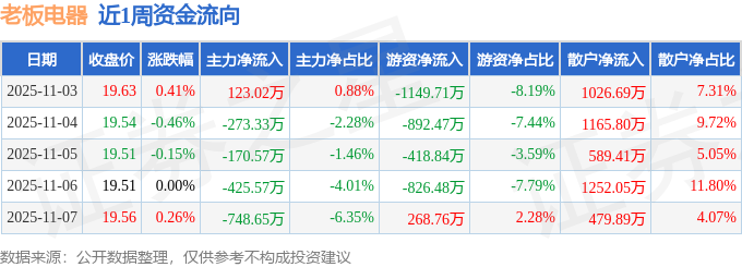 资金流向数据方面,本周老板电器主力资金合计净流出1495.09万元,游资资金合计净流出3018.74万元,散户资金合计净流入4513.84万元。本周资金流向一览见下表:
