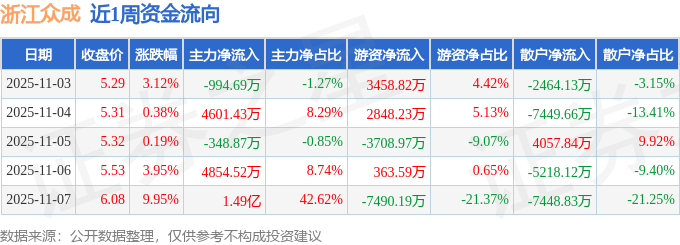 资金流向数据方面,本周浙江众成主力资金合计净流入2.31亿元,游资资金合计净流出4528.51万元,散户资金合计净流出1.85亿元。本周资金流向一览见下表: