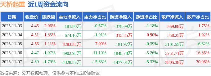 资金流向数据方面,本周天桥起重主力资金合计净流出5803.67万元,游资资金合计净流出3570.01万元,散户资金合计净流入9373.67万元。本周资金流向一览见下表: