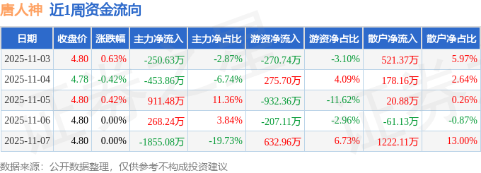 资金流向数据方面,本周唐人神主力资金合计净流出1379.84万元,游资资金合计净流出501.54万元,散户资金合计净流入1881.38万元。本周资金流向一览见下表: