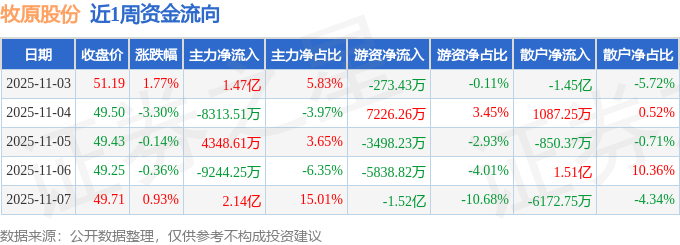 资金流向数据方面,本周牧原股份主力资金合计净流入2.29亿元,游资资金合计净流出1.76亿元,散户资金合计净流出5315.04万元。本周资金流向一览见下表: