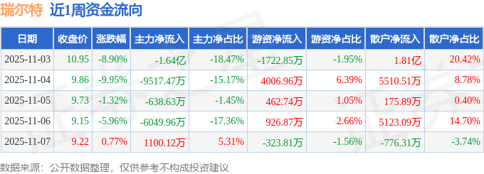 资金流向数据方面,本周瑞尔特主力资金合计净流出3.15亿元,游资资金合计净流入3349.9万元,散户资金合计净流入2.81亿元。本周资金流向一览见下表: