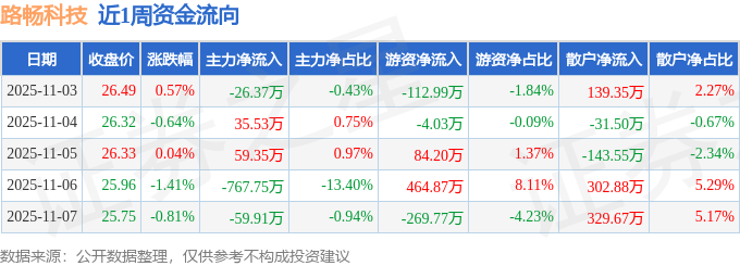 资金流向数据方面,本周路畅科技主力资金合计净流出759.14万元,游资资金合计净流入162.28万元,散户资金合计净流入596.86万元。本周资金流向一览见下表: