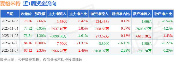 资金流向数据方面,本周麦格米特主力资金合计净流入10.29亿元,游资资金合计净流出6.62亿元,散户资金合计净流出3.66亿元。本周资金流向一览见下表: