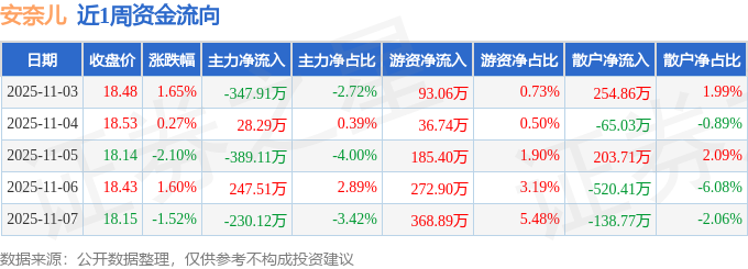 资金流向数据方面,本周安奈儿主力资金合计净流出691.34万元,游资资金合计净流入956.98万元,散户资金合计净流出265.64万元。本周资金流向一览见下表: