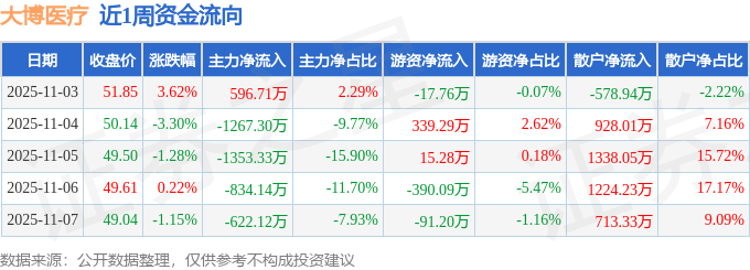 资金流向数据方面,本周大博医疗主力资金合计净流出3480.19万元,游资资金合计净流出144.48万元,散户资金合计净流入3624.67万元。本周资金流向一览见下表: