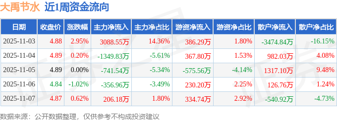 资金流向数据方面,本周大禹节水主力资金合计净流入846.4万元,游资资金合计净流入743.48万元,散户资金合计净流出1589.88万元。本周资金流向一览见下表:
