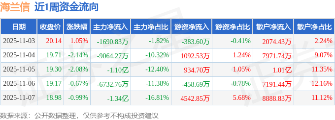 资金流向数据方面,本周海兰信主力资金合计净流出4.19亿元,游资资金合计净流入5727.79万元,散户资金合计净流入3.62亿元。本周资金流向一览见下表: