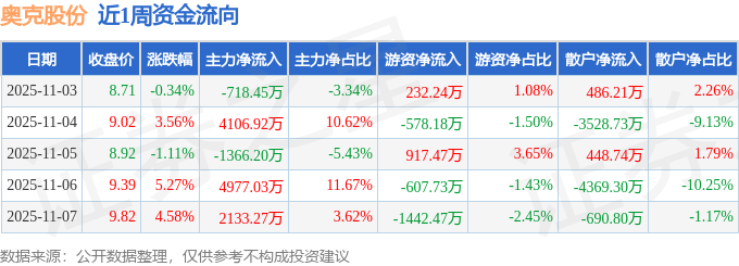 资金流向数据方面,本周奥克股份主力资金合计净流入9132.57万元,游资资金合计净流出1478.68万元,散户资金合计净流出7653.89万元。本周资金流向一览见下表: