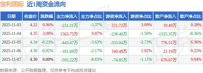 资金流向数据方面,本周宝利国际主力资金合计净流入112.17万元,游资资金合计净流出274.08万元,散户资金合计净流入161.91万元。本周资金流向一览见下表: