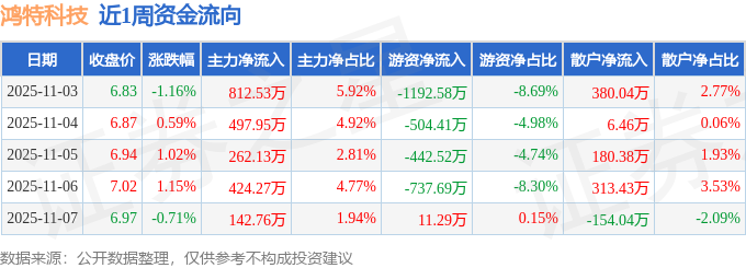 资金流向数据方面,本周鸿特科技主力资金合计净流入2139.64万元,游资资金合计净流出2865.91万元,散户资金合计净流入726.27万元。本周资金流向一览见下表: