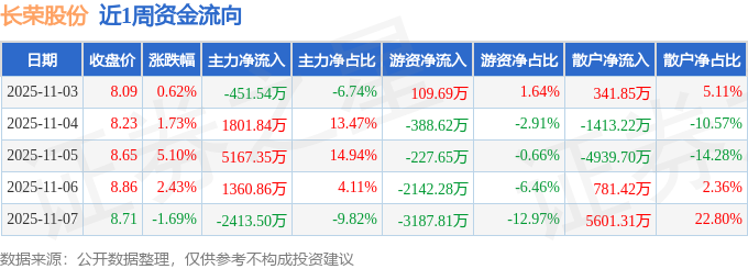 资金流向数据方面,本周长荣股份主力资金合计净流入5465.0万元,游资资金合计净流出5836.67万元,散户资金合计净流入371.67万元。本周资金流向一览见下表: