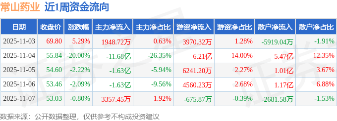 资金流向数据方面,本周常山药业主力资金合计净流出14.41亿元,游资资金合计净流入7.62亿元,散户资金合计净流入6.79亿元。本周资金流向一览见下表: