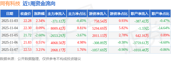 资金流向数据方面,本周同有科技主力资金合计净流入1.11亿元,游资资金合计净流入6697.77万元,散户资金合计净流出1.78亿元。本周资金流向一览见下表: