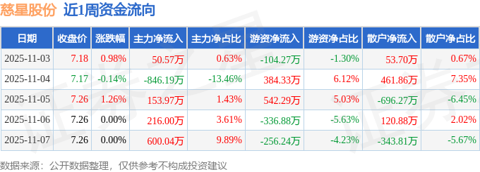 资金流向数据方面,本周慈星股份主力资金合计净流入174.39万元,游资资金合计净流入229.24万元,散户资金合计净流出403.63万元。本周资金流向一览见下表: