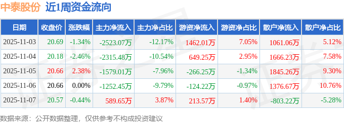 资金流向数据方面,本周中泰股份主力资金合计净流出7080.35万元,游资资金合计净流入1934.35万元,散户资金合计净流入5145.99万元。本周资金流向一览见下表: