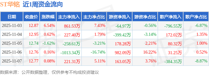 资金流向数据方面,本周ST华铭主力资金合计净流入38.29万元,游资资金合计净流入859.02万元,散户资金合计净流出897.31万元。本周资金流向一览见下表: