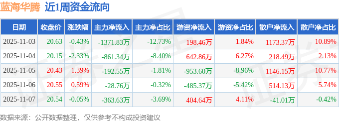 资金流向数据方面,本周蓝海华腾主力资金合计净流出2818.12万元,游资资金合计净流出193.0万元,散户资金合计净流入3011.12万元。本周资金流向一览见下表: