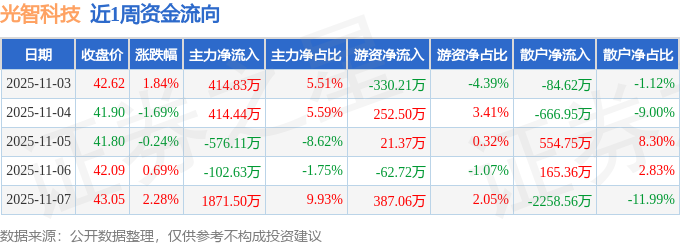 资金流向数据方面,本周光智科技主力资金合计净流入2022.03万元,游资资金合计净流入267.99万元,散户资金合计净流出2290.02万元。本周资金流向一览见下表: