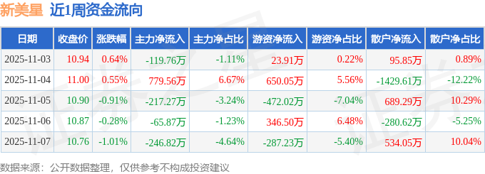 资金流向数据方面,本周新美星主力资金合计净流入129.83万元,游资资金合计净流入261.2万元,散户资金合计净流出391.04万元。本周资金流向一览见下表: