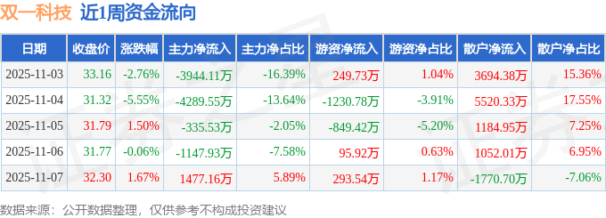 资金流向数据方面,本周双一科技主力资金合计净流出8239.96万元,游资资金合计净流出1441.01万元,散户资金合计净流入9680.97万元。本周资金流向一览见下表: