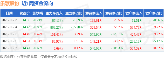 资金流向数据方面,本周乐歌股份主力资金合计净流出706.3万元,游资资金合计净流出498.61万元,散户资金合计净流入1204.91万元。本周资金流向一览见下表: