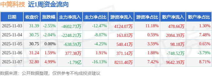 资金流向数据方面,本周中简科技主力资金合计净流出2.5亿元,游资资金合计净流入1.34亿元,散户资金合计净流入1.16亿元。本周资金流向一览见下表: