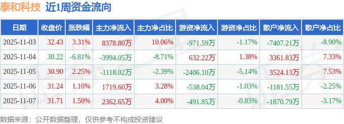 资金流向数据方面,本周泰和科技主力资金合计净流入7348.97万元,游资资金合计净流出3775.37万元,散户资金合计净流出3573.6万元。本周资金流向一览见下表: