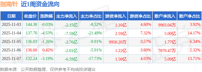 资金流向数据方面,本周指南针主力资金合计净流出21.1亿元,游资资金合计净流入7.46亿元,散户资金合计净流入13.64亿元。本周资金流向一览见下表: