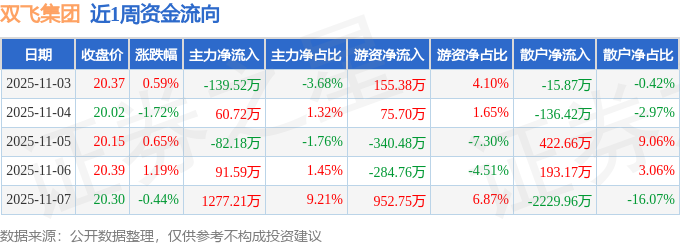 资金流向数据方面,本周双飞集团主力资金合计净流入1207.82万元,游资资金合计净流入558.6万元,散户资金合计净流出1766.42万元。本周资金流向一览见下表: