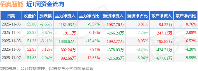 资金流向数据方面,本周佰奥智能主力资金合计净流出1356.54万元,游资资金合计净流入1321.15万元,散户资金合计净流入35.38万元。本周资金流向一览见下表: