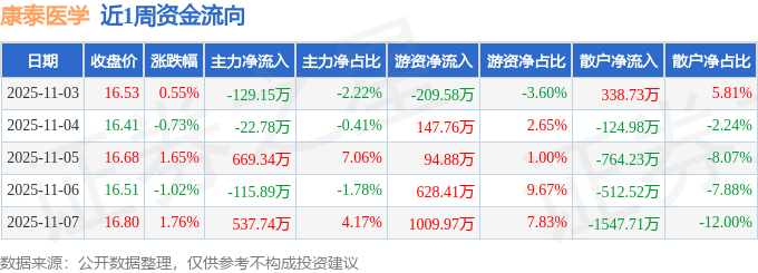 资金流向数据方面,本周康泰医学主力资金合计净流入939.27万元,游资资金合计净流入1671.44万元,散户资金合计净流出2610.7万元。本周资金流向一览见下表: