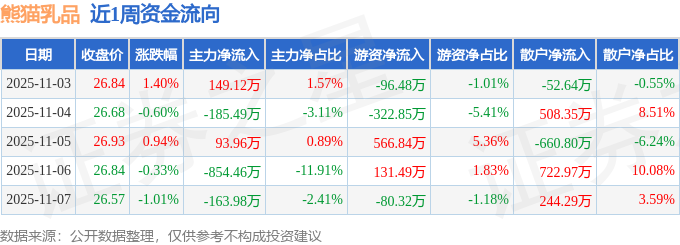 资金流向数据方面,本周熊猫乳品主力资金合计净流出960.84万元,游资资金合计净流入198.68万元,散户资金合计净流入762.16万元。本周资金流向一览见下表: