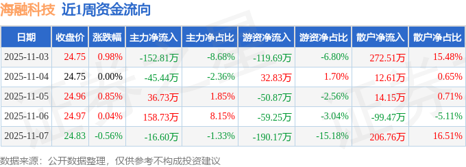 资金流向数据方面,本周海融科技主力资金合计净流出19.4万元,游资资金合计净流出387.16万元,散户资金合计净流入406.55万元。本周资金流向一览见下表: