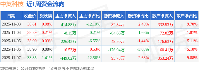 资金流向数据方面,本周中英科技主力资金合计净流出1081.95万元,游资资金合计净流出13.69万元,散户资金合计净流入1095.64万元。本周资金流向一览见下表: