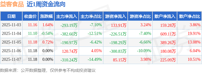 资金流向数据方面,本周益客食品主力资金合计净流出1056.26万元,游资资金合计净流出506.56万元,散户资金合计净流入1562.82万元。本周资金流向一览见下表:
