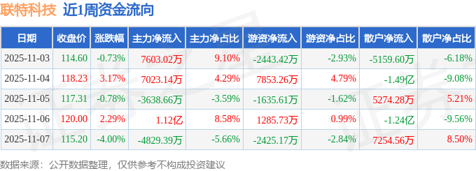 沪深股通持股方面,截止2025年11月7日收盘,联特科技深股通持股数为129.34万股,占流通股比为190.0%。