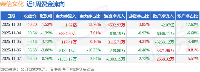 资金流向数据方面,本周荣信文化主力资金合计净流入1.67亿元,游资资金合计净流入5267.5万元,散户资金合计净流出2.2亿元。本周资金流向一览见下表:
