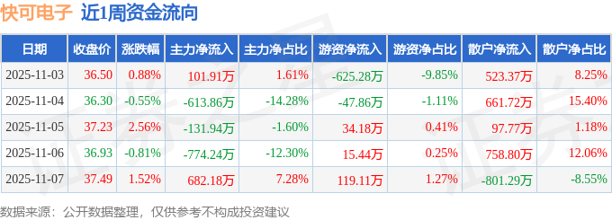 资金流向数据方面,本周快可电子主力资金合计净流出735.94万元,游资资金合计净流出504.43万元,散户资金合计净流入1240.36万元。本周资金流向一览见下表: