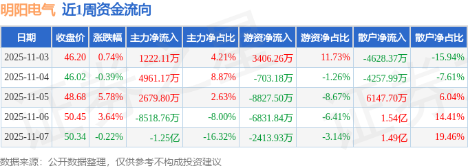 资金流向数据方面,本周明阳电气主力资金合计净流出1.22亿元,游资资金合计净流出1.54亿元,散户资金合计净流入2.76亿元。本周资金流向一览见下表: